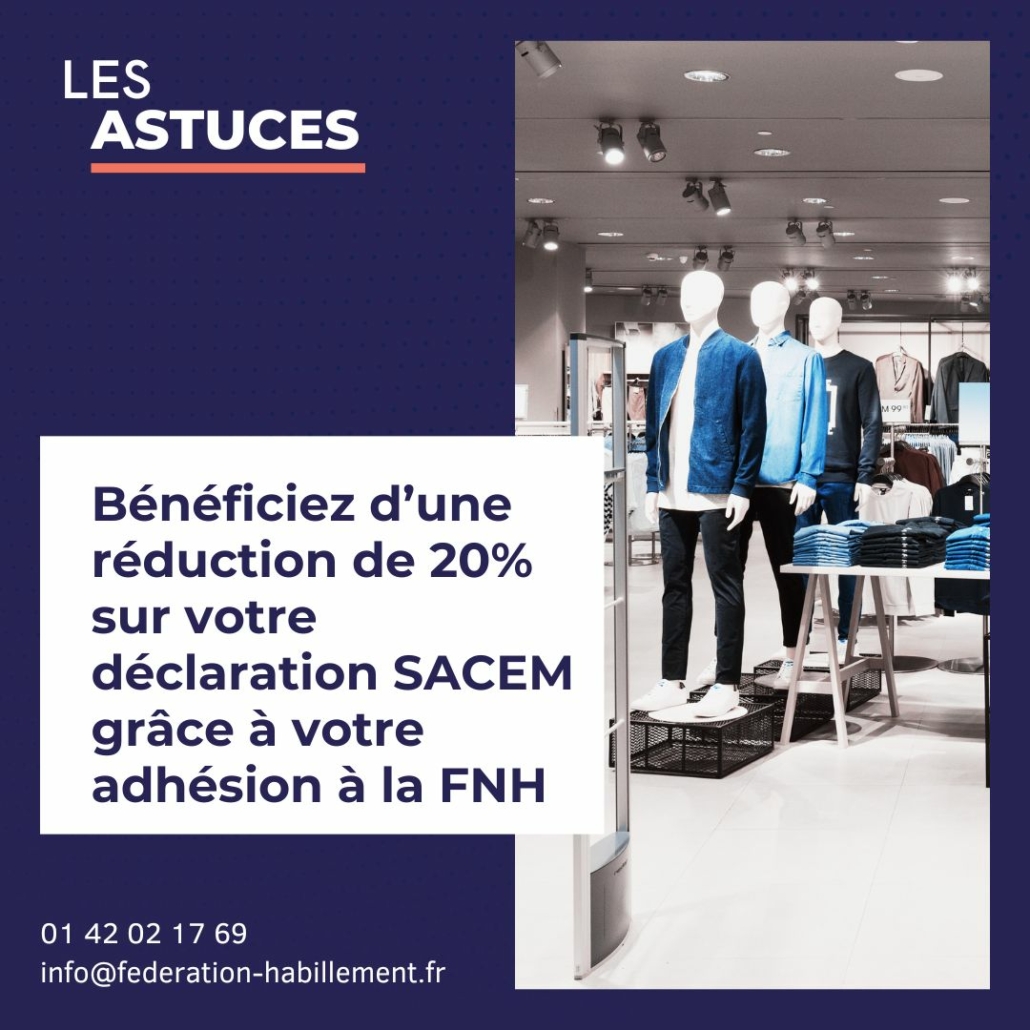 Vous bénéficiez d’une réduction de 20 % en tant qu’adhérent à la Fédération Nationale de l’Habillement (FNH).